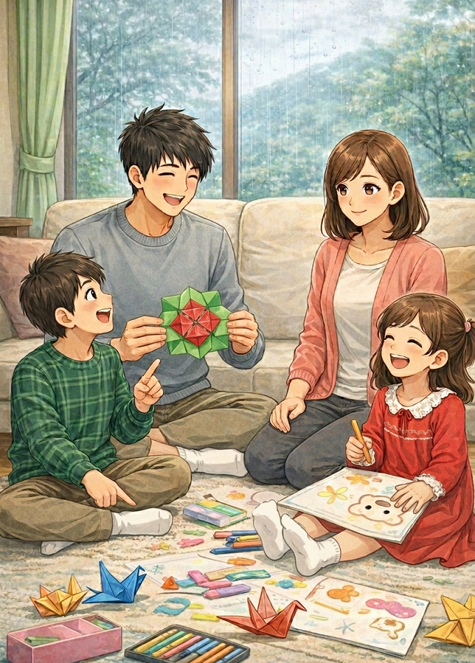 雨が降った日は、おうち時間を楽しむ日。子どもと一緒に折り紙を折ってみたり、お絵かきあてっこゲームをしたり。何気ない遊びですが、笑い声が広がると、それだけで部屋の中がぱっと明るくなります。外で思いきり遊べなくても、工夫次第で楽しい時間はつくれるものですね。